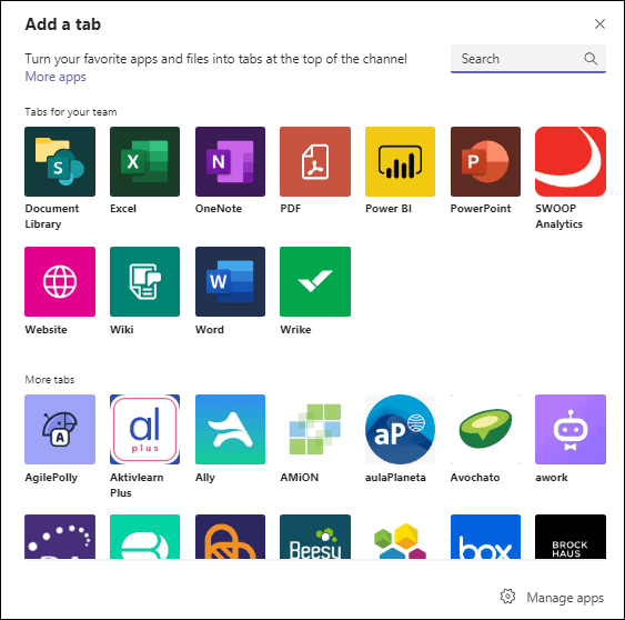 Step 2: The 'Add a tab' window will open, displaying a variety of apps you can integrate. Choose the app you wish to add. Options include Microsoft Word, Excel, websites, and many more.