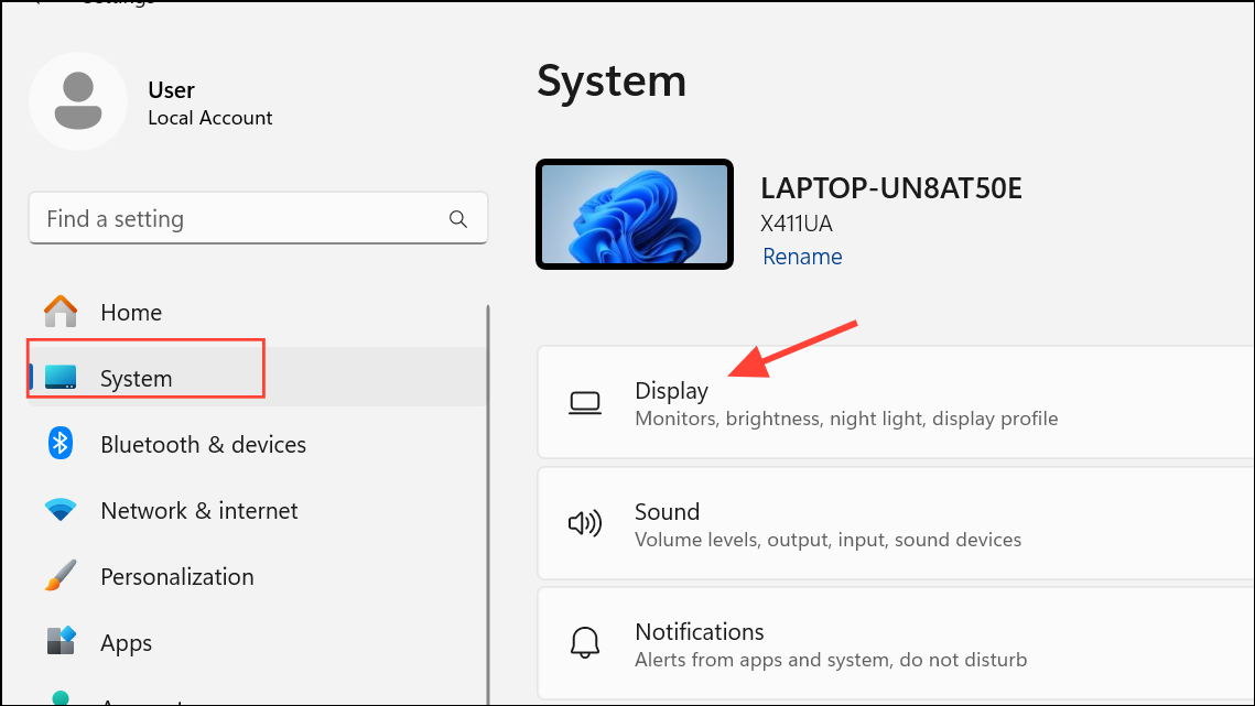 Step 2: In the Settings window, select System from the left sidebar, then click Display on the right.