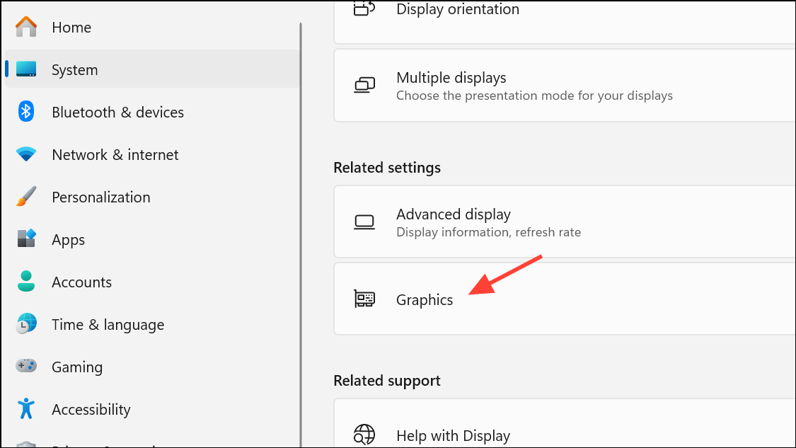 Step 1: Open Settings (Windows + I), navigate to System > Display, then select Graphics further down the page.