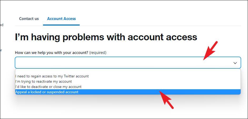 After that, use the dropdown menu for 'How can we help you with your account' and select the 'Appeal a locked or suspended account' option.