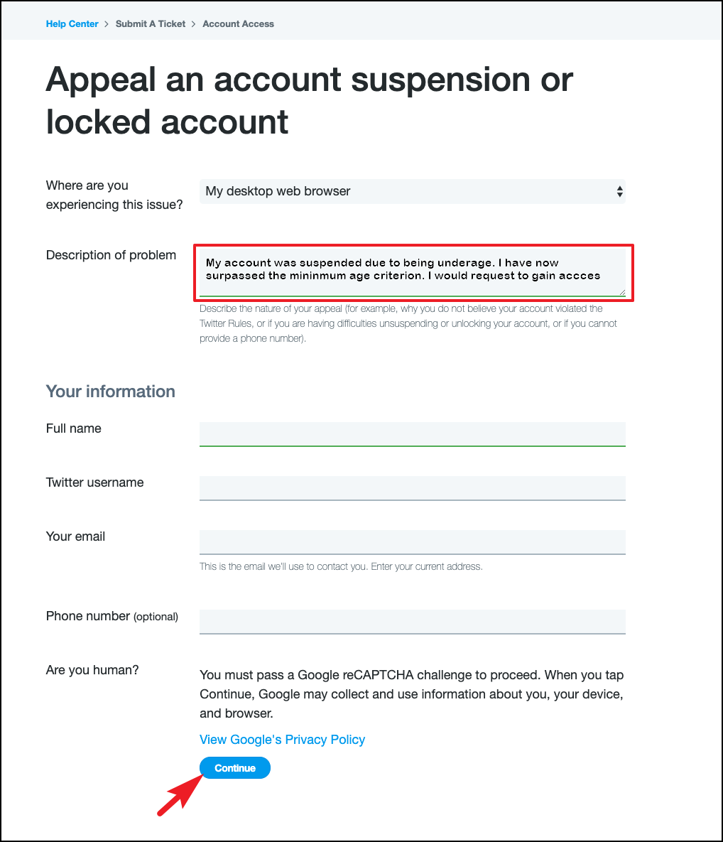 Next, you will be required to fill out a form where you will need to enter your basic details, like Full name, email address, and Twitter username along with the description of the problem. You can mention that your account had been suspended due to being underage and since now you have surpassed the minimum age criterion, you would like to request access to your account. Click on 'Continue' to proceed.
