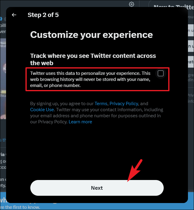 On the next screen, uncheck the option and click on the 'Next' button. Unchecking the option will not allow Twitter to collect your web activity to personalize your experience as per your browsing history and Internet activity.