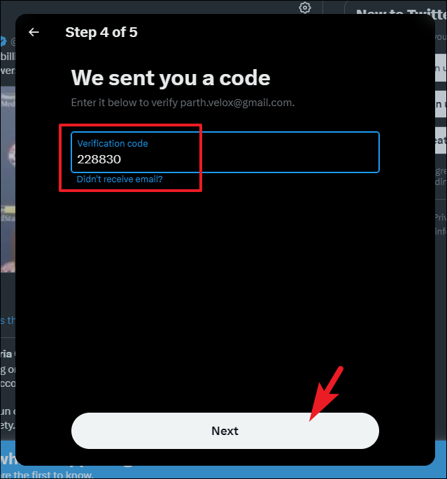 After you have completed the captcha, you will receive a verification code on your email address or phone number depending on what you opted for to create your account. Enter the code and click on the 'Next' button to proceed.