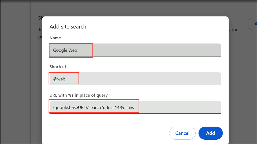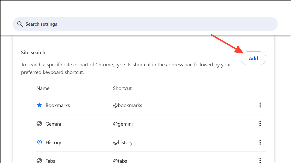 Step 2: Scroll down to the “Site search” section and click the “Add” button. This opens a dialog to create a new custom search entry.
