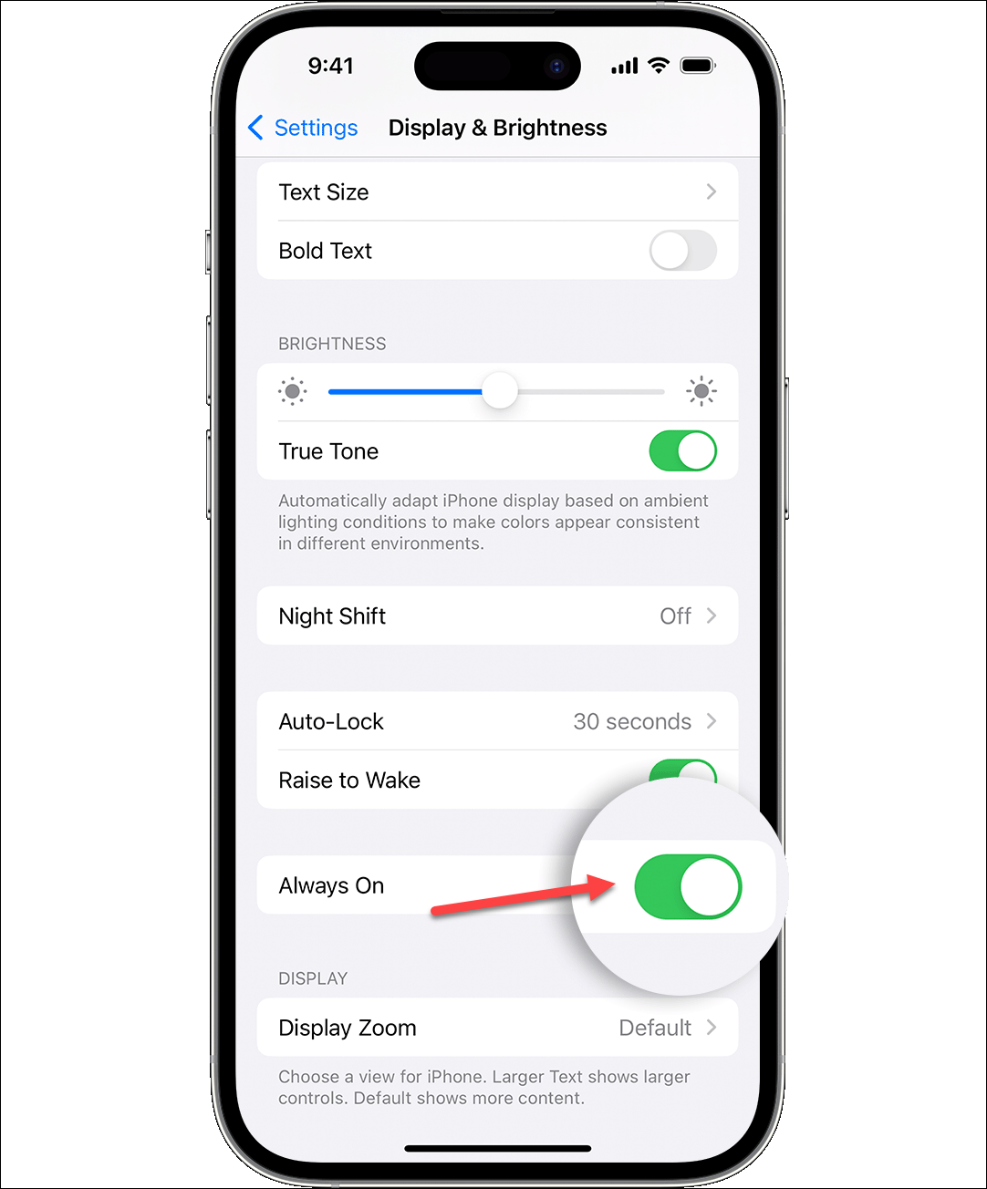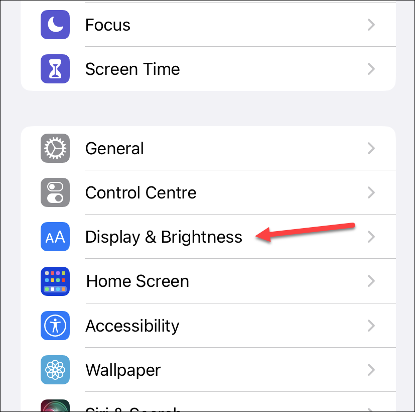 Always-On Display is turned on by default. To disable it, open the Settings app on your iPhone 14 Pro or Pro Max. Then, go to the option for ‘Display & Brightness’.