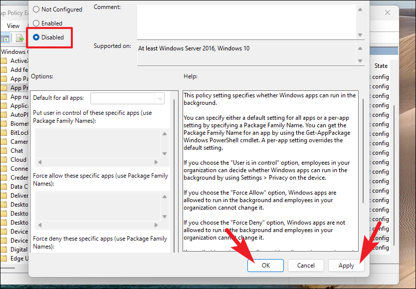 Step 5: Select the 'Disabled' option to prevent apps from running in the background. Click 'Apply' and then 'OK' to confirm.