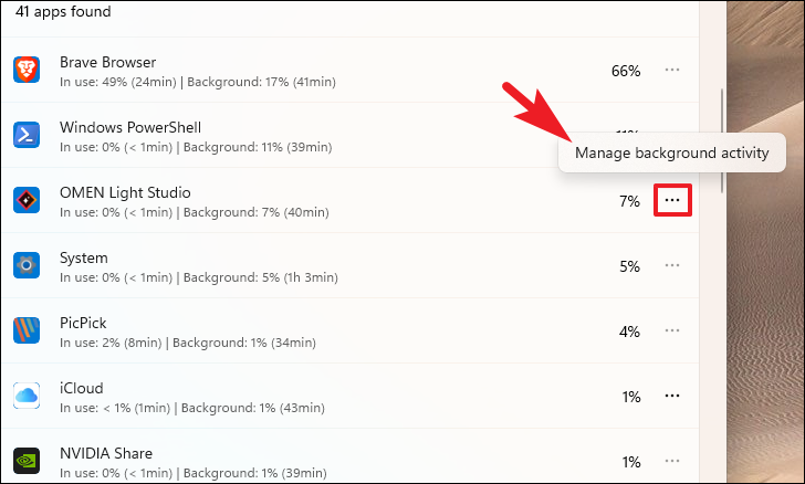 Step 6: Click the 'ellipsis' (three dots) next to the app and select 'Manage background activity'.