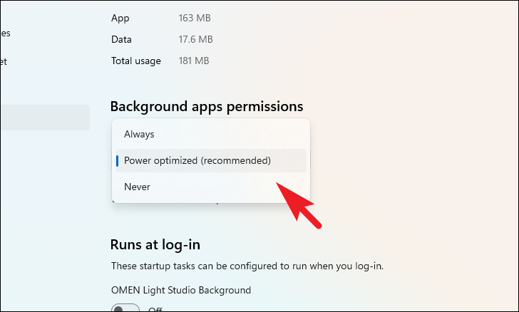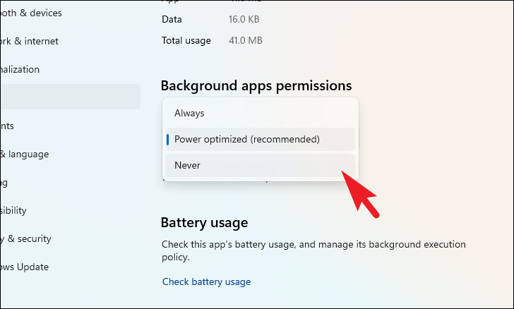 Step 7: Under 'Background apps permissions', choose 'Never' from the dropdown menu to stop the app from running in the background.