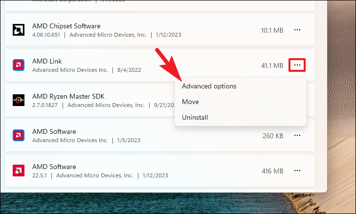 Step 4: Find the app you wish to restrict. Click on the 'ellipsis' (three dots) next to it and select 'Advanced options' from the dropdown menu.