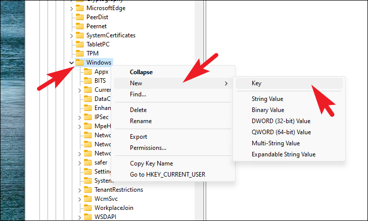 Step 3: Right-click on the 'Windows' key, hover over 'New', and select 'Key' from the menu. Name the new key AppPrivacy.