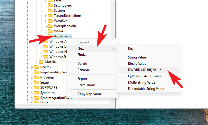 Step 4: Right-click on the newly created AppPrivacy key, hover over 'New', and choose 'DWORD (32-bit) Value'.
