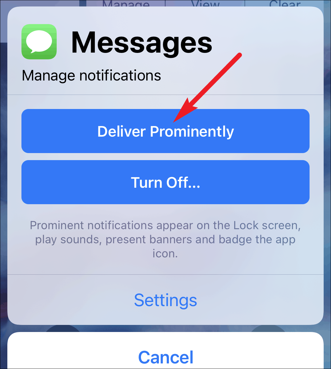 Step 3: Tap on Manage, then select Deliver Prominently. This will restore normal notification settings for iMessage, allowing alerts to appear on the lock screen and play sounds.