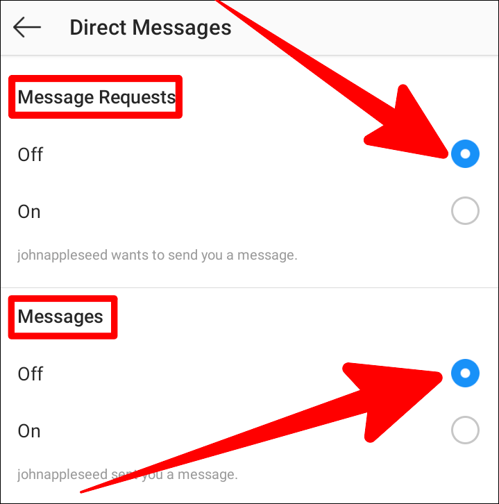 On the ‘Direct Messages’ screen, the first and second options would be ‘Message Requests’ and ‘Messages’ respectively. Tap on the buttons next to ‘Off’ on both options so that these plain buttons now turn blue.