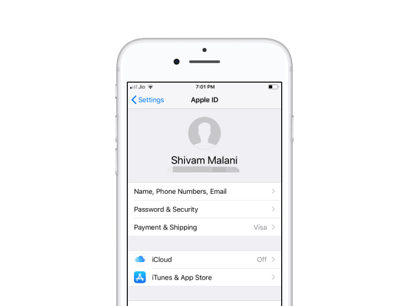 - Tap [your name] at the top of the Settings screen to access your Apple ID page.