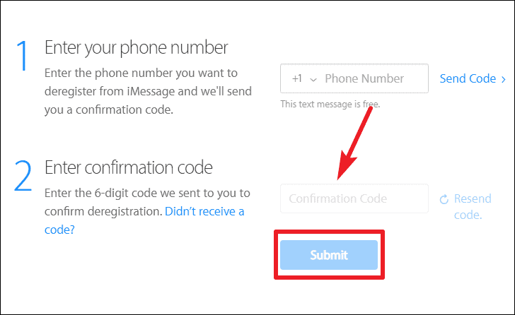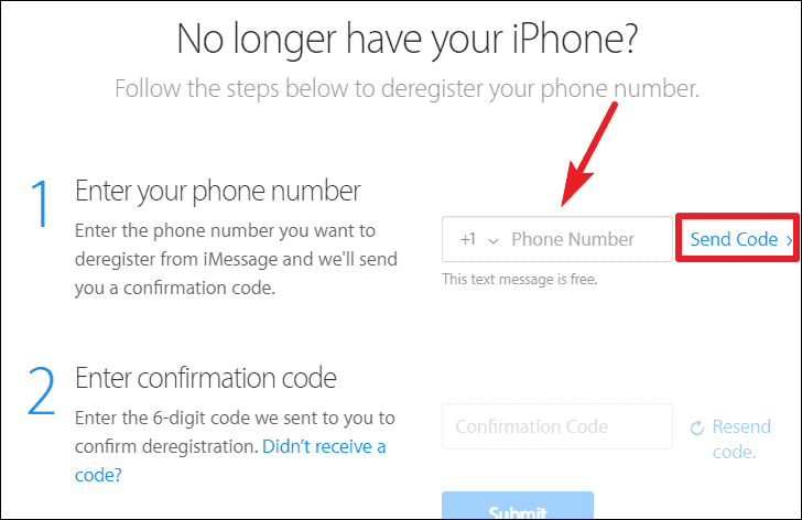 Step 2: Enter the phone number you wish to deregister and click 'Send code'.