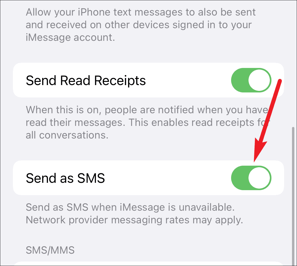 Then, toggle on the 'Send as SMS' option to allow your messages to be sent as standard texts when iMessage is unavailable.
