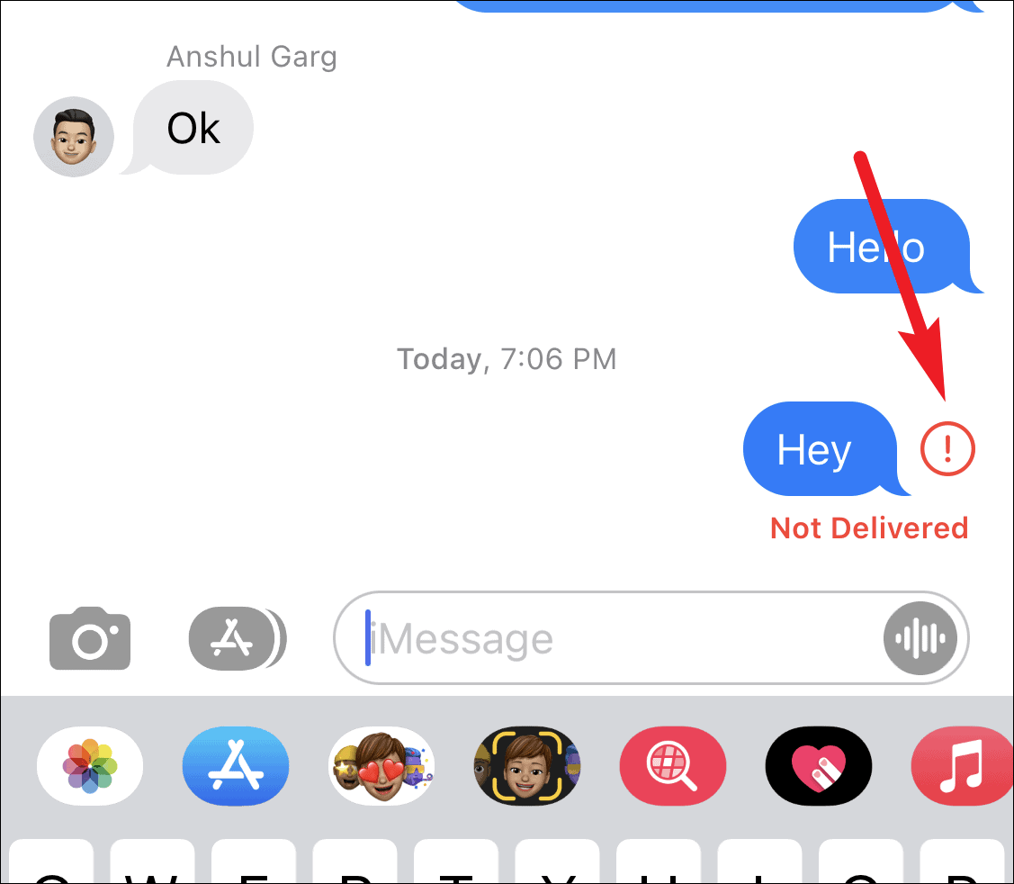 Step 2: Attempt to send a message to the contact through the Messages app. Since your device isn't connected to the internet, the message will fail to send via iMessage.