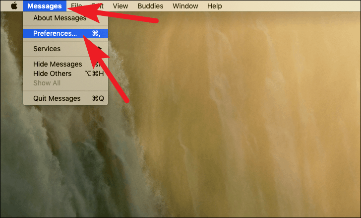 Step 2: In the menu bar at the top of the screen, click on Messages, then select Preferences. Alternatively, you can press Command+, on your keyboard to open Preferences quickly.