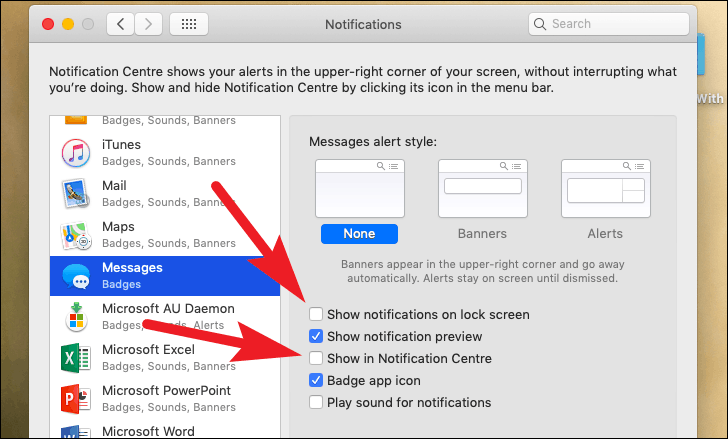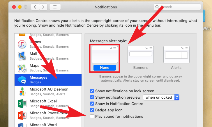 Step 3: In the left sidebar, scroll down and select Messages. Then, under the "Message alert style" section, choose None. To disable sound notifications, uncheck the box next to Play sound for notifications.