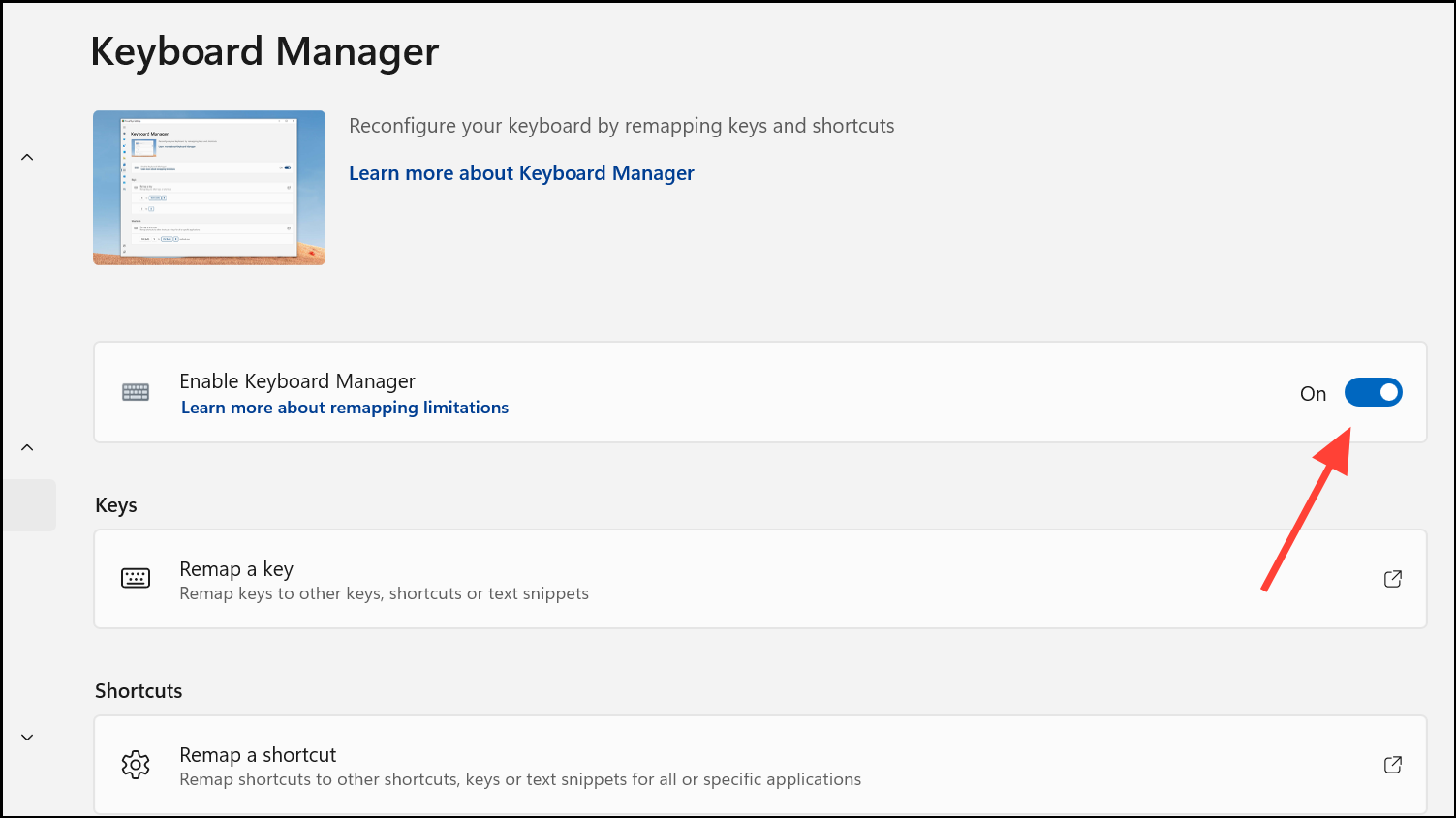 Step 2: Open PowerToys and select “Keyboard Manager” from the sidebar. Enable the “Enable Keyboard Manager” toggle if it is not already active.