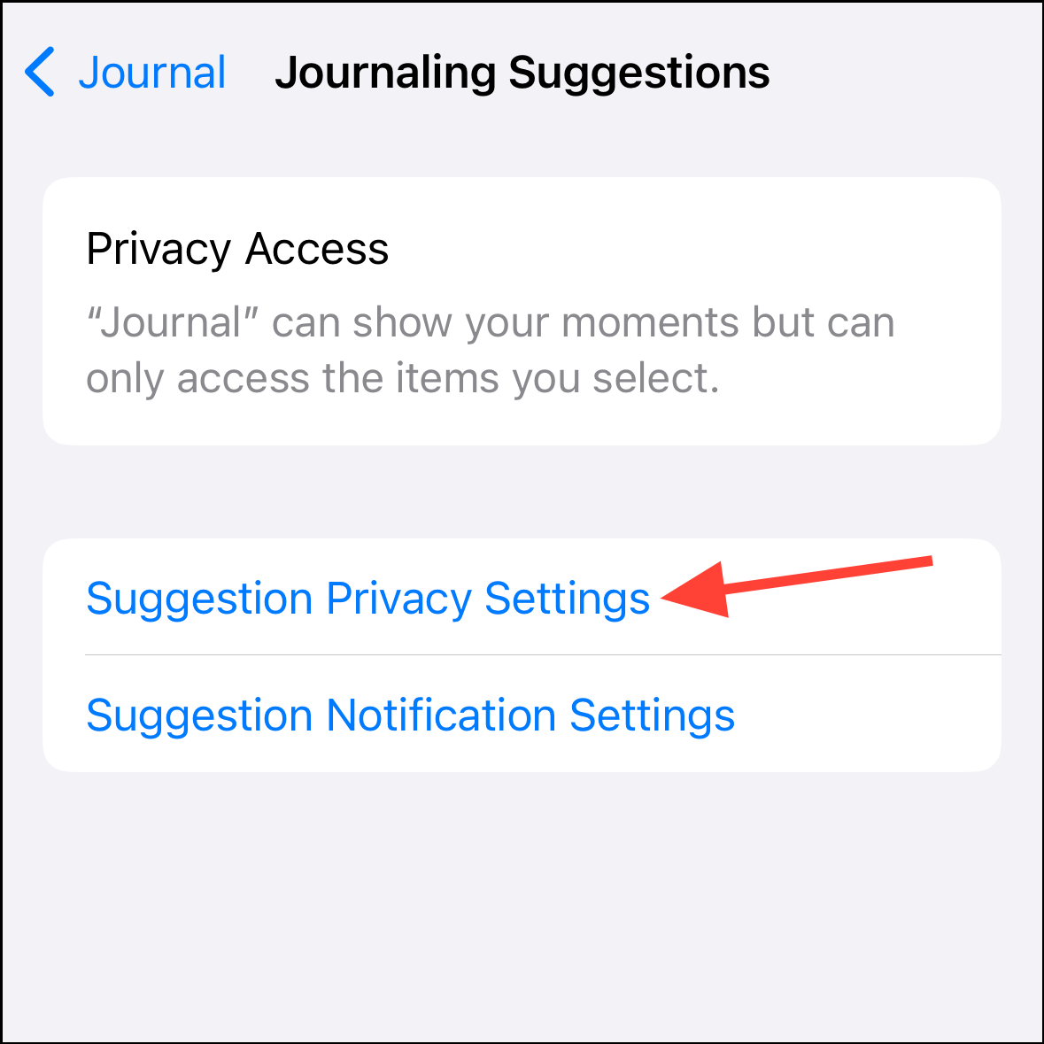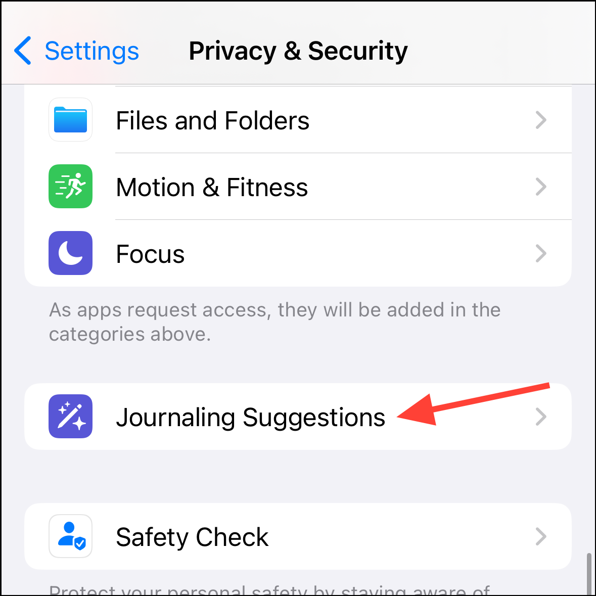 Privacy & Security>Journaling Suggestionsto reach the same screen.