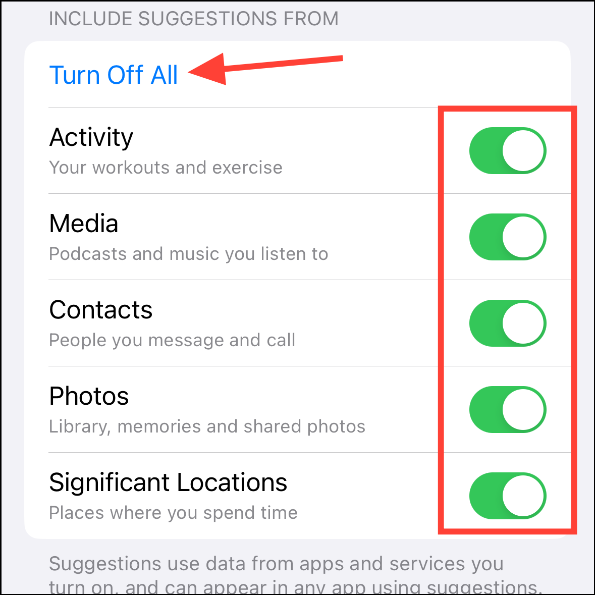 - Here, you can either turn off the toggle for individual services you want to disable or tap 'Turn Off All' to disable them altogether.