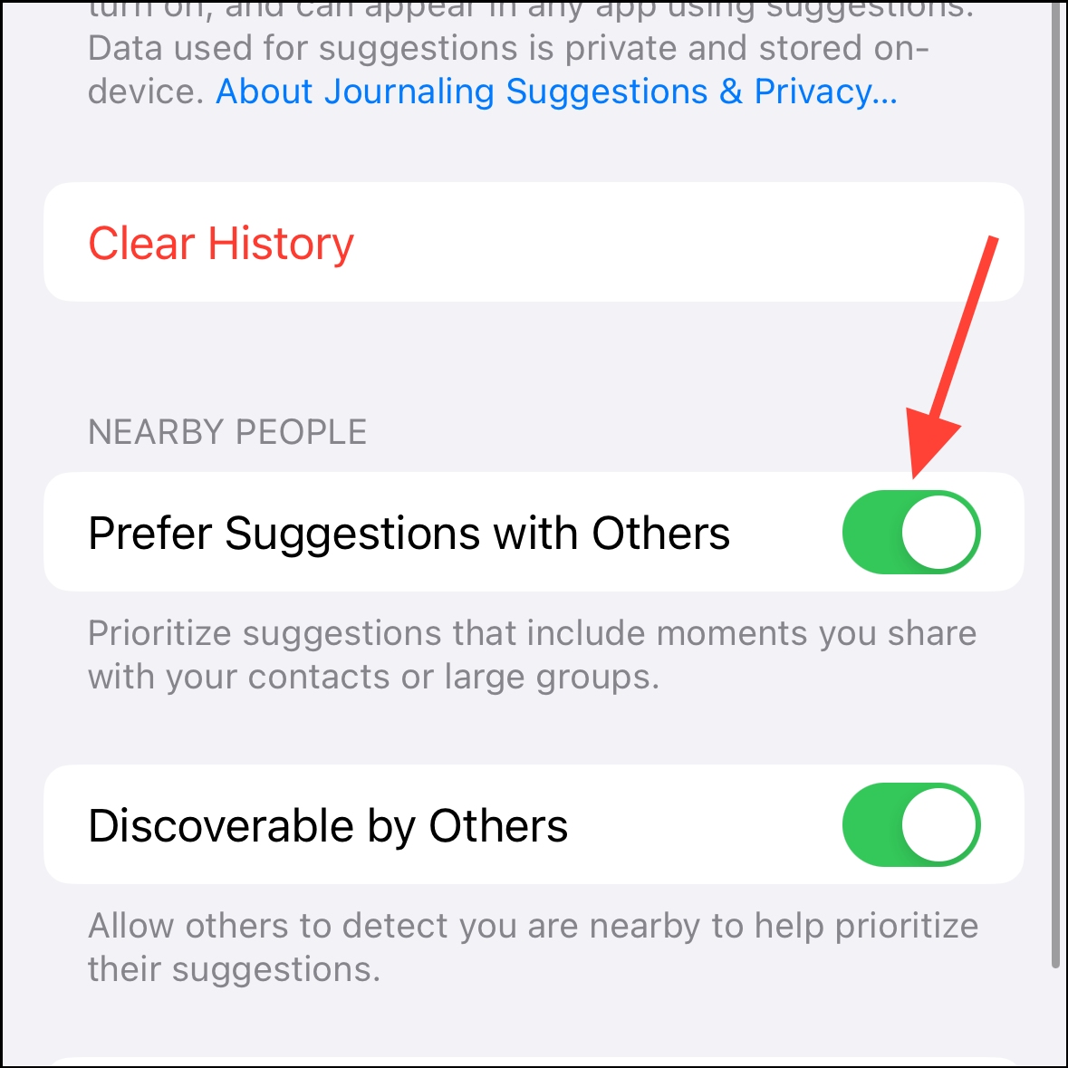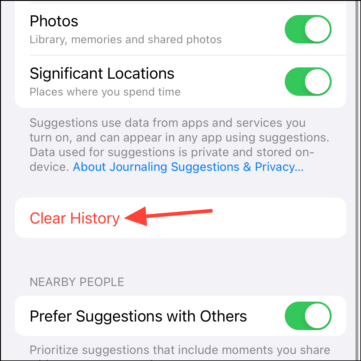 - If you would like to keep Journaling Suggestions disabled but don't want to see the suggestions based on the past few days, tap 'Clear History' to start with a clean slate.
