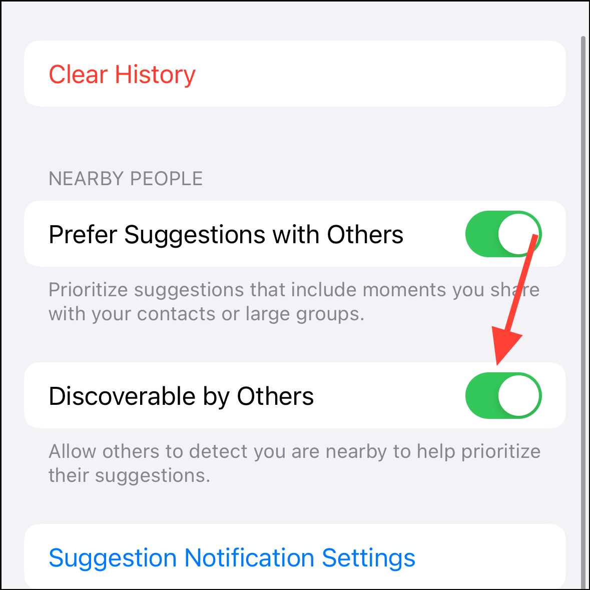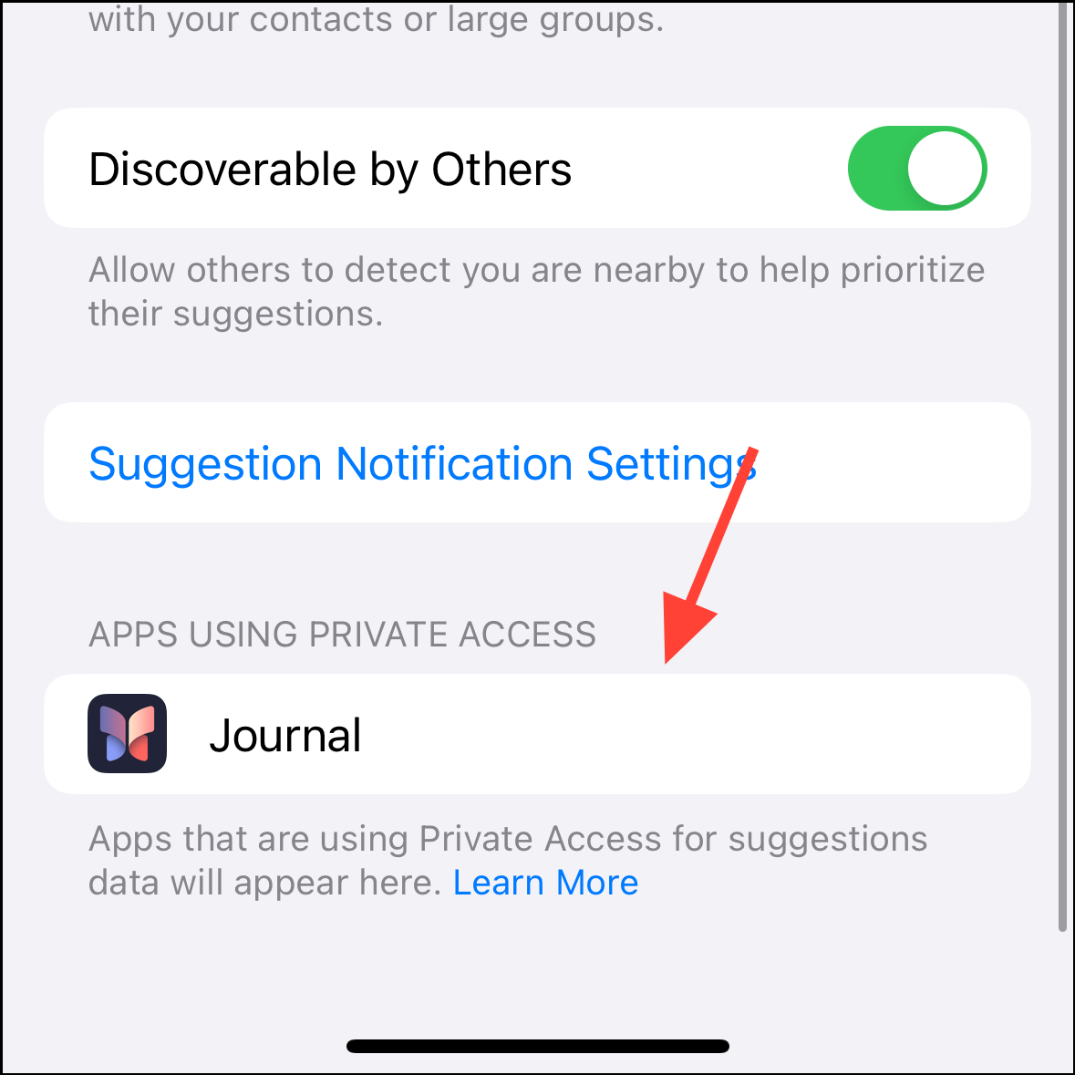 - If you don't want to allow your device to be detected by others around you for their Journaling Suggestions, you can turn off the toggle for 'Discoverable by Others'.