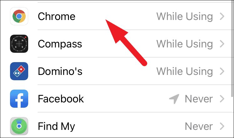 After that, scroll down and locate the ‘Chrome’ option, and tap on it to open its location settings.