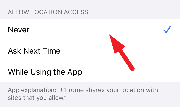 Finally, tap on the ‘Never’ option situated under the ‘Allow Location Access’ section on your screen.