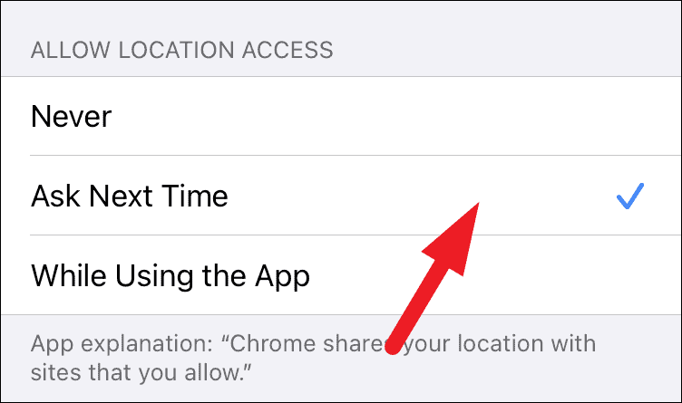 Alternatively, in case you want to selectively share your location with the websites you visit using Chrome, you can tap on the ‘Ask Next Time’ option to make Chrome ask for your permission every time a website requests your location.