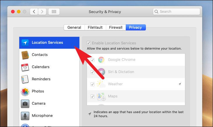 Then, click on the ‘Location Services’ tile situated on the left sidebar of the ‘Security & Privacy’ window.