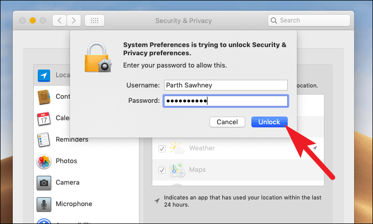 Now, enter your user account password in the space provided and click on the ‘Unlock’ button.