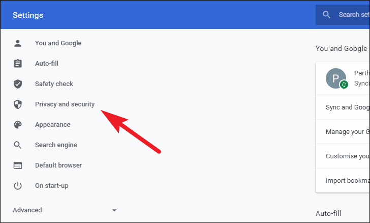 Then, click on the ‘Privacy and security’ tab present on the left sidebar of the Chrome window.