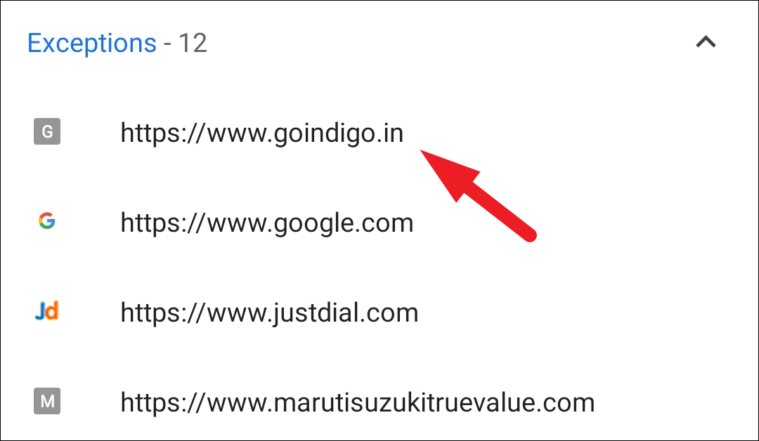 To block or remove the websites from the exception list, tap on the individual website listing. This will open a separate overlay window on your device screen.