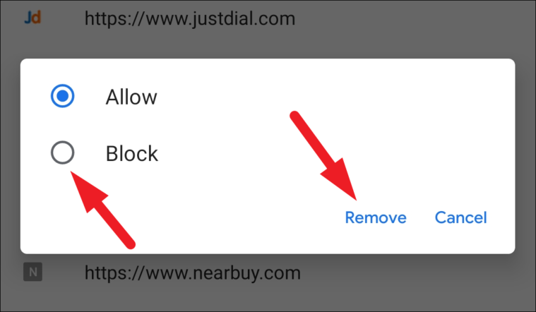 Now, tap on the radio button preceding the ‘Block’ option if you wish to block the website even in the case you allow location access manually in the future. Otherwise, delete the website from the exceptions list, tap on the ‘Remove’ button situated on the bottom left corner of the overlay window.