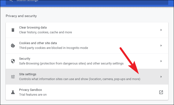 Now, click on the ‘Site settings’ option present on the ‘Privacy and settings’ page of the Chrome browser.