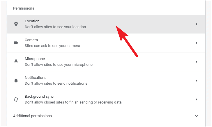 Then, scroll down and locate the ‘Permissions’ section. After that, click on the ‘Location’ tab present under the section.