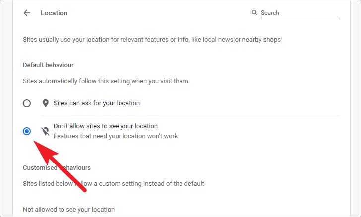 Now, click on the radio button preceding the ‘Don’t allow sites to see your location’ to block all the sites from requesting to access your location.