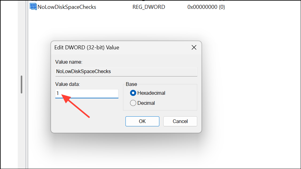 Step 5: Double-click NoLowDiskSpaceChecks, set its value data to 1, and click OK. This tells Windows not to show low disk space warnings for your user account.