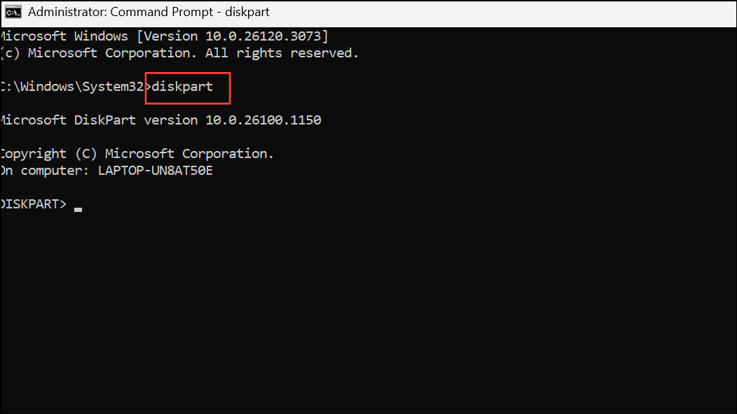 Step 2: In the Command Prompt window, type diskpart and press Enter. This tool manages disk partitions and drive letters.