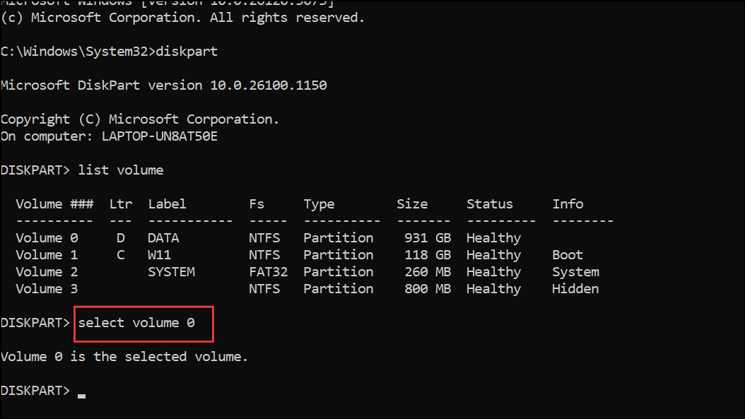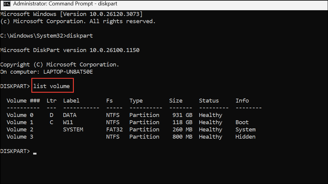 Step 3: Enter list volume to display all disk volumes and their letters. Identify the volume number corresponding to the drive letter you want to hide (such as D:).