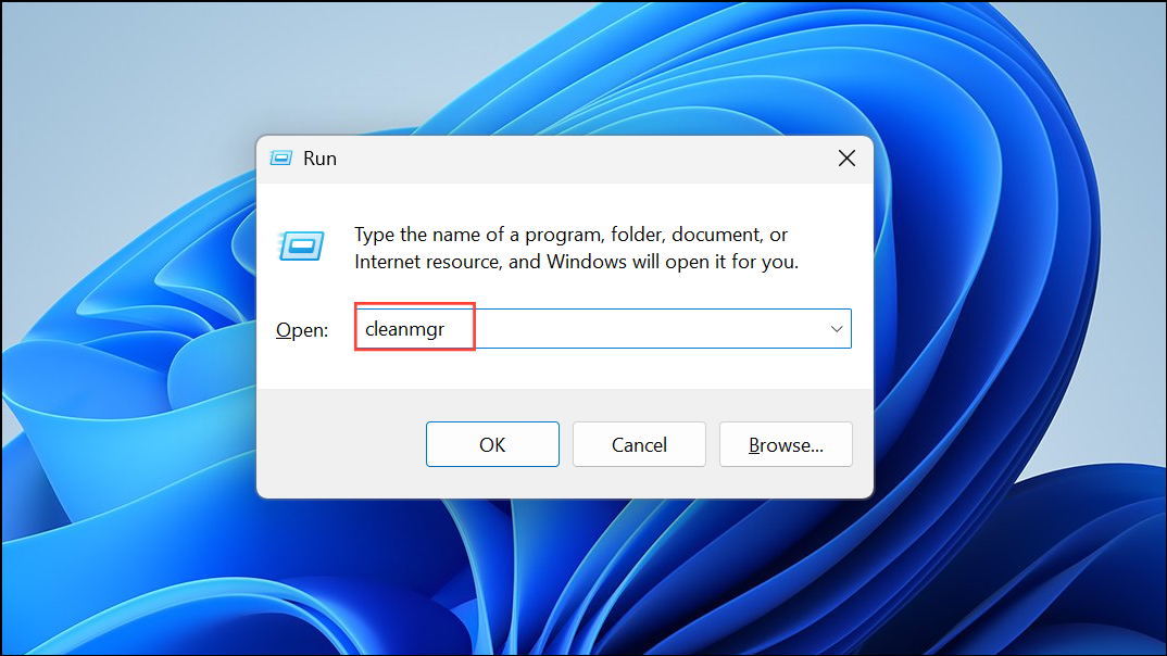 Step 1: Press Win + R, type cleanmgr, and press Enter. The Disk Cleanup tool scans for files that can be safely deleted.