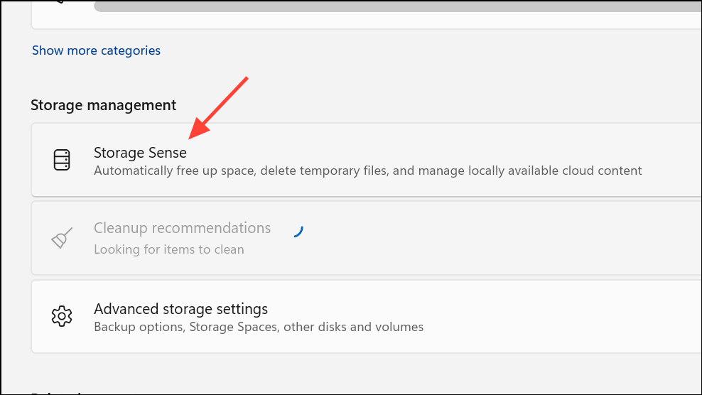 Step 2: Click on Storage Sense to configure how often it runs and what types of files it deletes (such as files in the Recycle Bin or Downloads folder after a specified number of days).