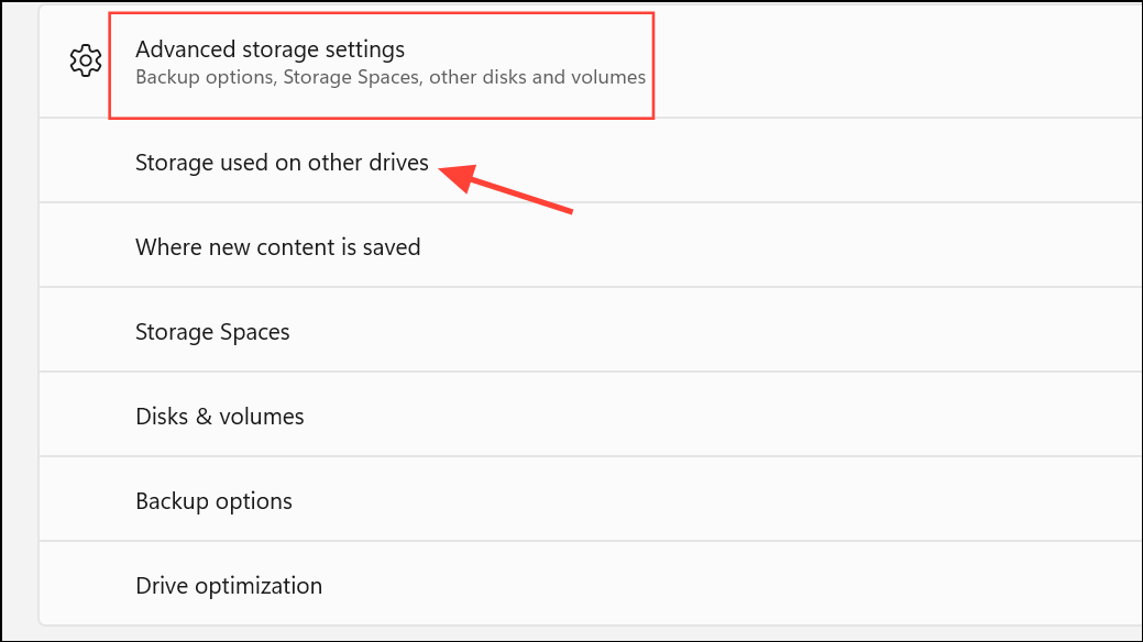 Step 4: Storage Sense focuses on the system drive by default. To manage other drives, use Advanced storage settings > Storage used on other drives in the Storage menu.