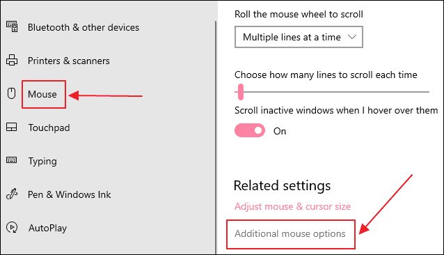 Step 3: From the left-hand menu, click on Mouse. Then, on the right side, click on Additional mouse options under the Related settings section.