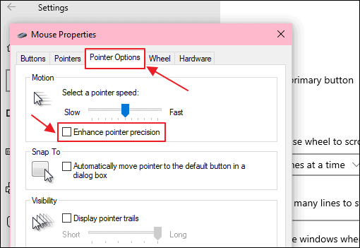 Step 4: In the Mouse Properties window that appears, navigate to the Pointer Options tab. Under the Motion section, uncheck the box next to Enhance pointer precision to disable mouse acceleration.
