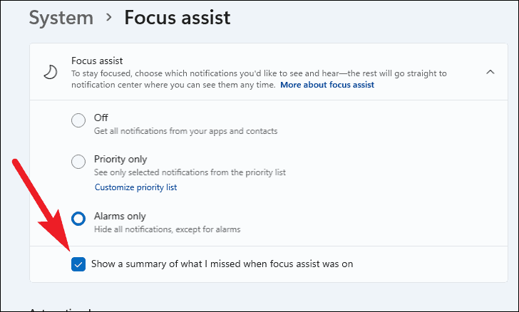 Alarms onlyto hide all notifications except for alarms. - To receive a summary of missed notifications, check
