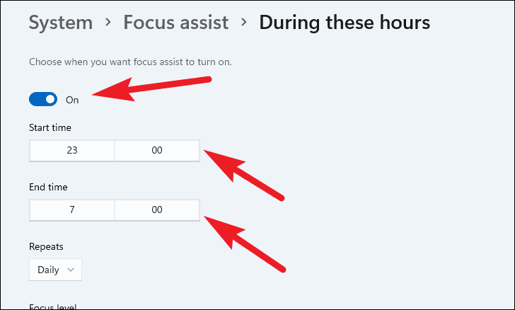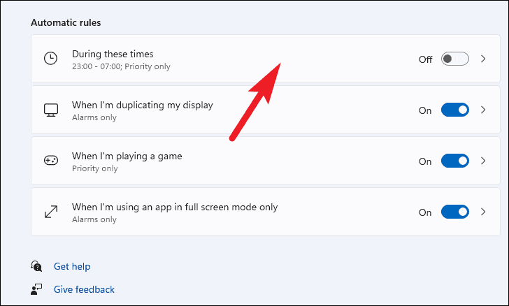Automatic rules, click onDuring these timesto set up a schedule for Focus Assist.