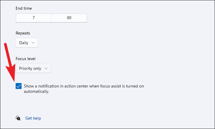 Show notification in action center when focus assist is turned on automaticallyto be notified when Focus Assist activates.
